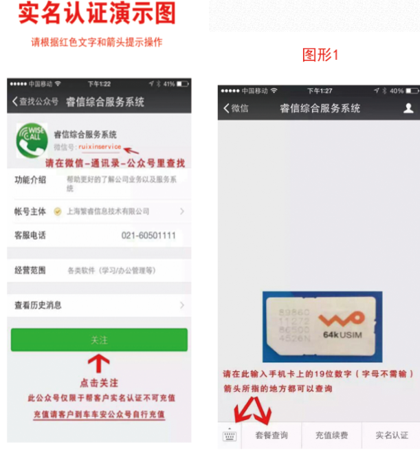 使用繁睿2G流量卡,無限流量卡實(shí)名認(rèn)證:首先在微信里面關(guān)注睿信綜合服務(wù)系統(tǒng)公眾號(hào)。